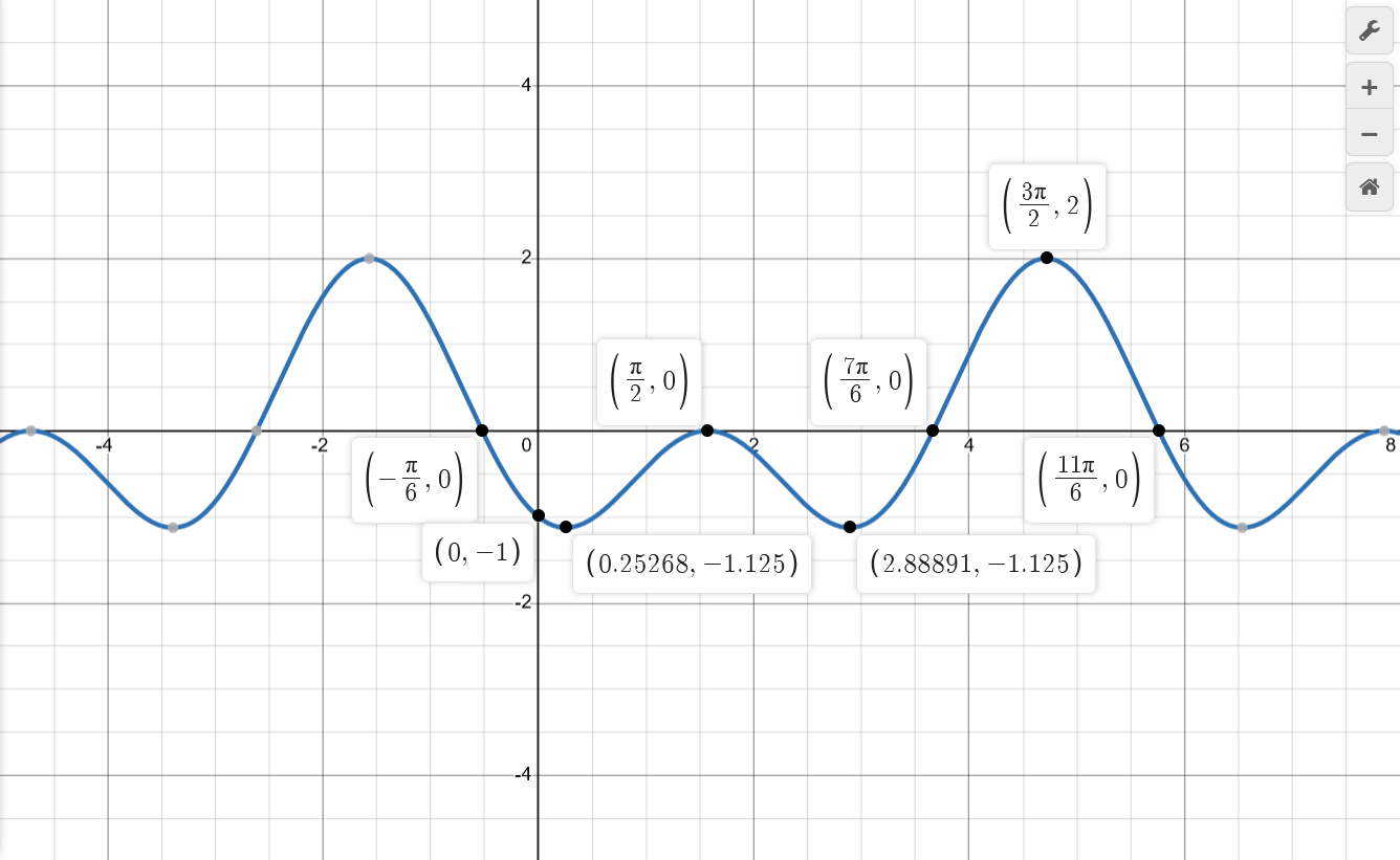 All the information gathered before can be used to sketch the plot. This is where it turns useful to have grouped the relevant x-coordinates under a common denominator (e.g. $x_0 \in \{(2n-\frac{1}{6})\pi, (2n+\frac{3}{6})\pi, (2n+\frac{7}{6})\pi\}$); it makes it easier to place the points in their correct locations.